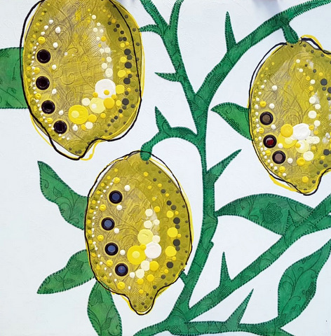 Lemon Squeezy August 28, 2019August 28, 2019 | oucho1964 Sewn Wool, Acrylic Paint, wax and metal on upholstery fabric 110x110cm